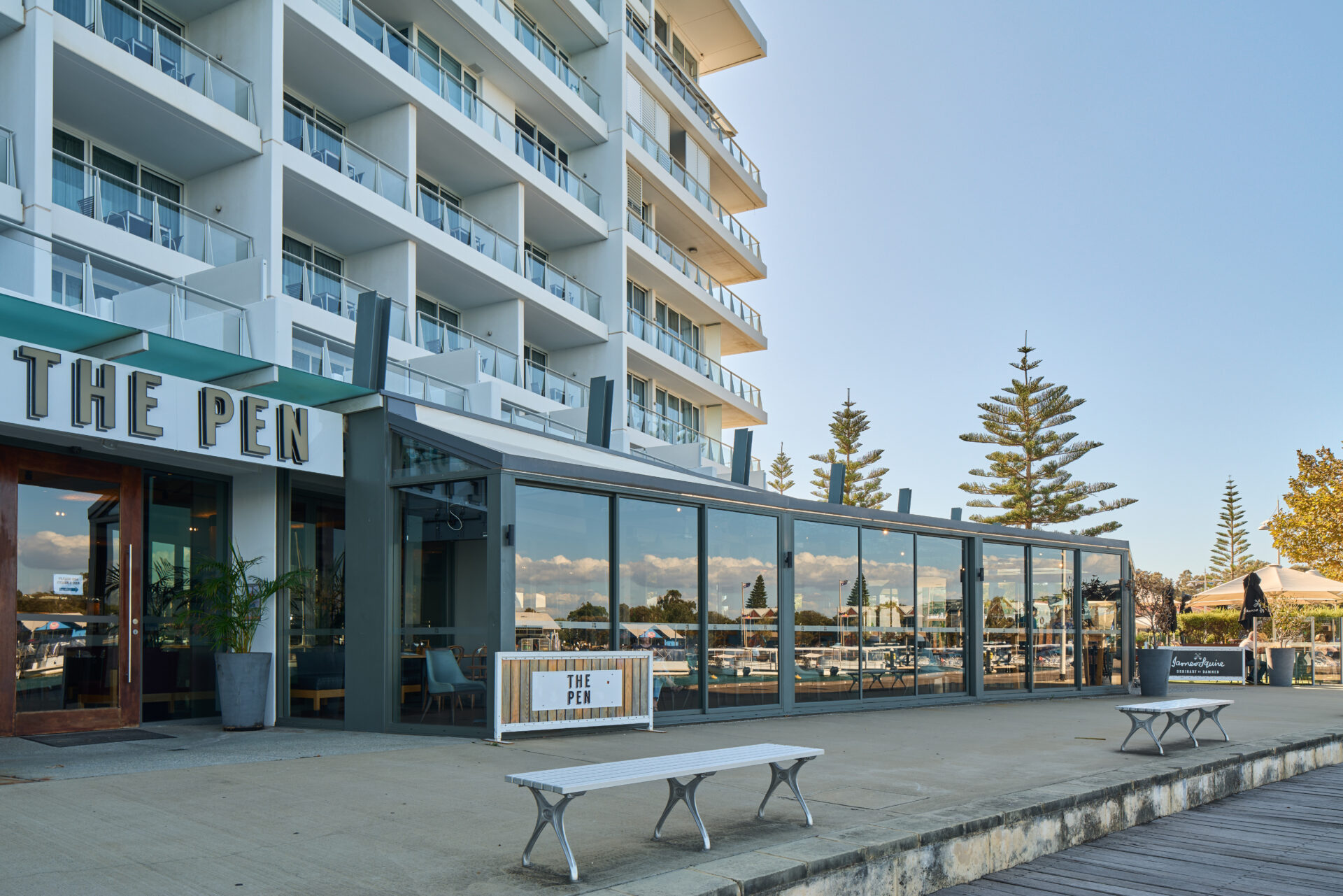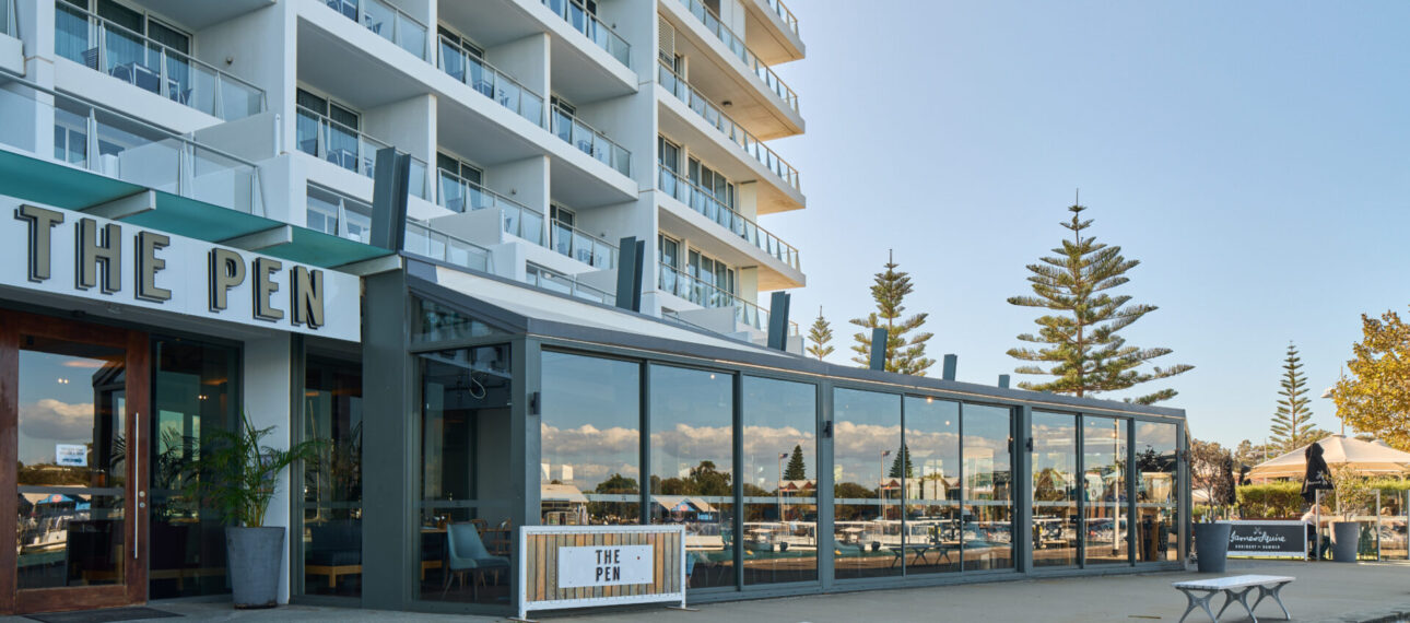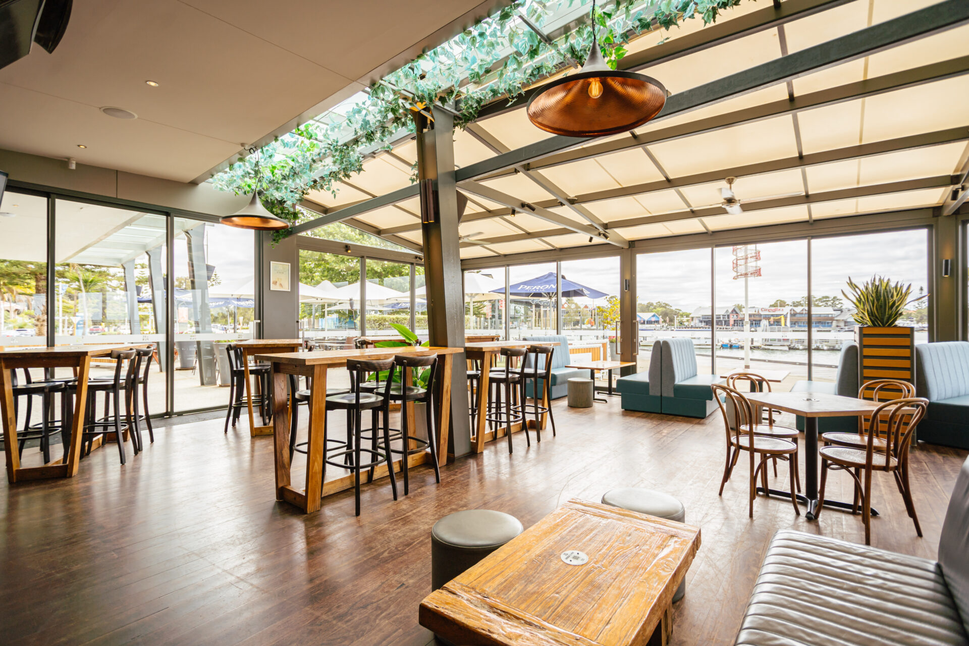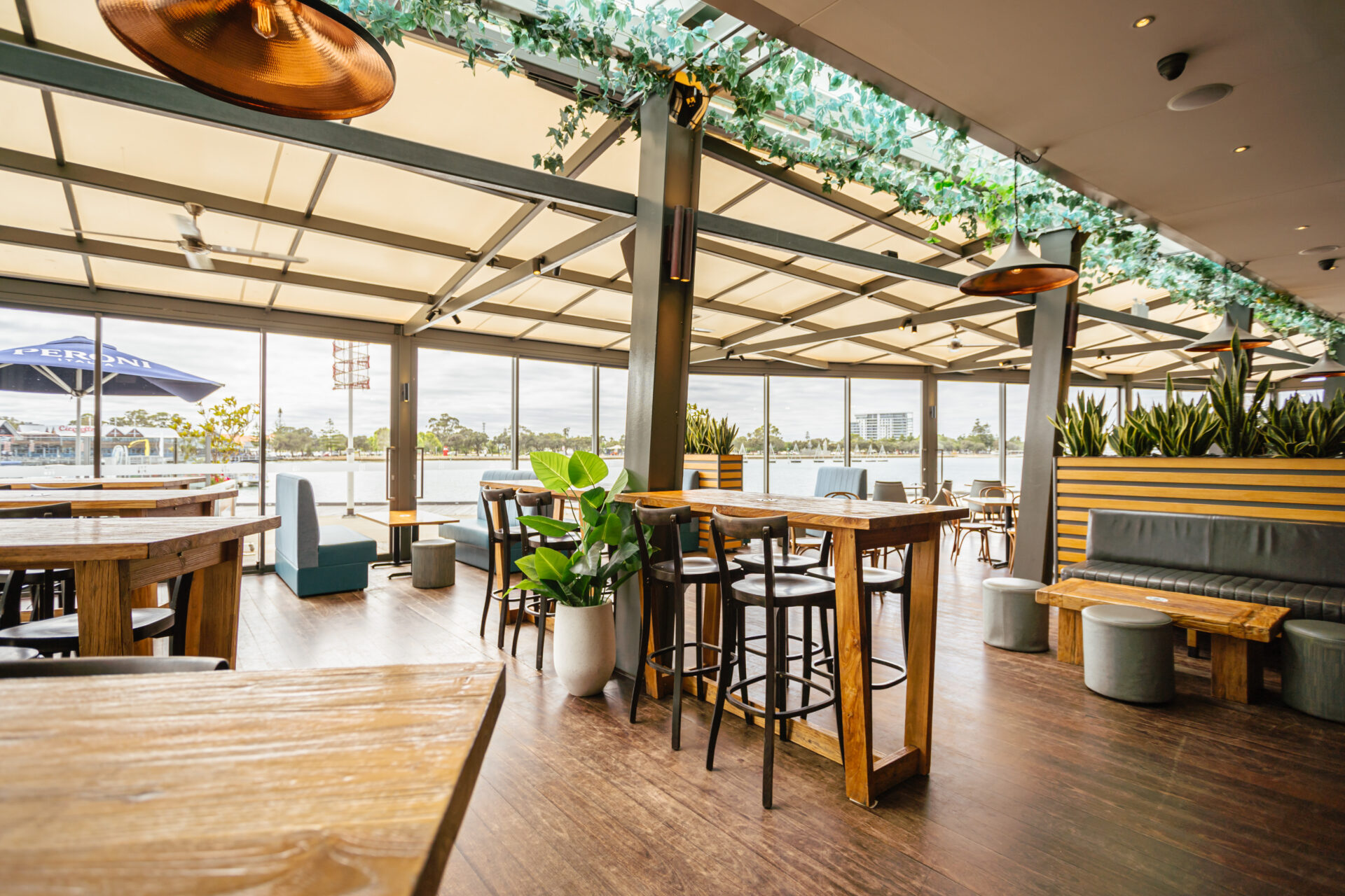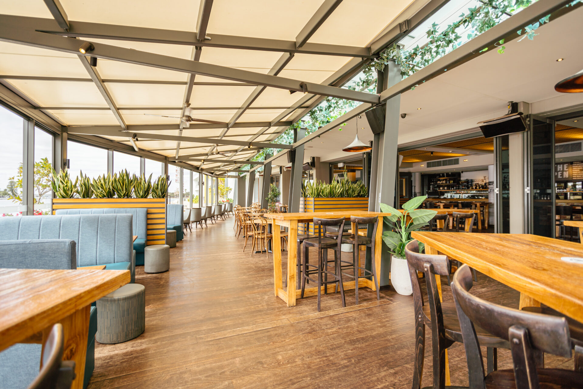 Our glass-walled water-facing vergola is suited for events all year round. Capable of holding events between 3-120 guests whilst facilitating for both high and low seating, the vergola is our most popular area for entertaining.